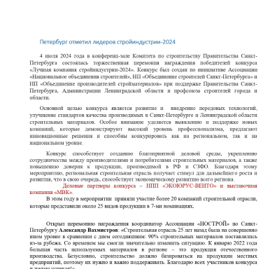 4 июля 2024 года в конференц-зале Комитета по строительству Правительства Санкт-Петербурга состоялась торжественная церемония награждения победителей конкурса «Лучшая компания стройиндустрии-2024». Конкурс был создан по инициативе Ассоциации «Национальное объединения строителей», НП «Объединение строителей Санкт-Петербурга» и НП «Объединение производителей стройматериалов» при поддержке Правительства Санкт-Петербурга, Администрации Ленинградской области и профсоюза строителей города и области.